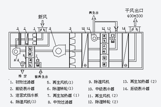 整個機組有過濾段,風冷卻段,轉輪除濕段,后冷卻段,風機段等組成。